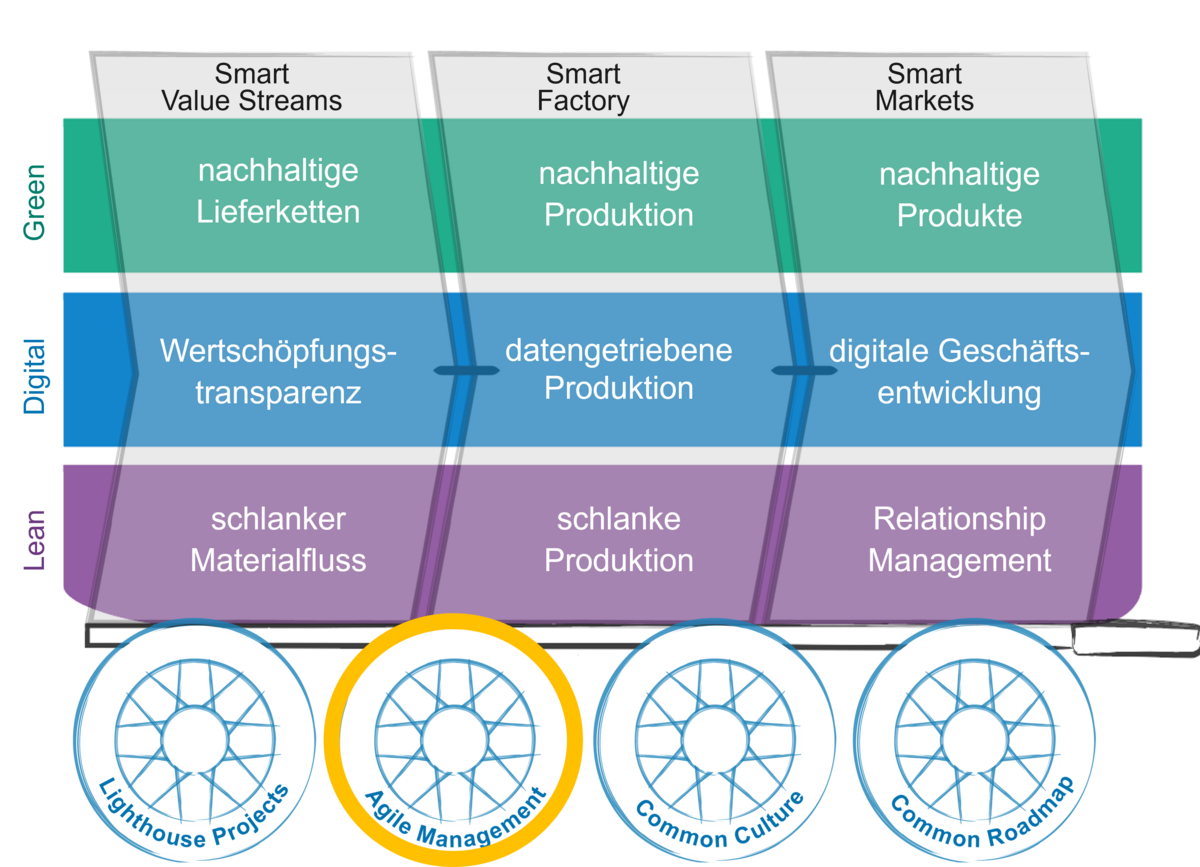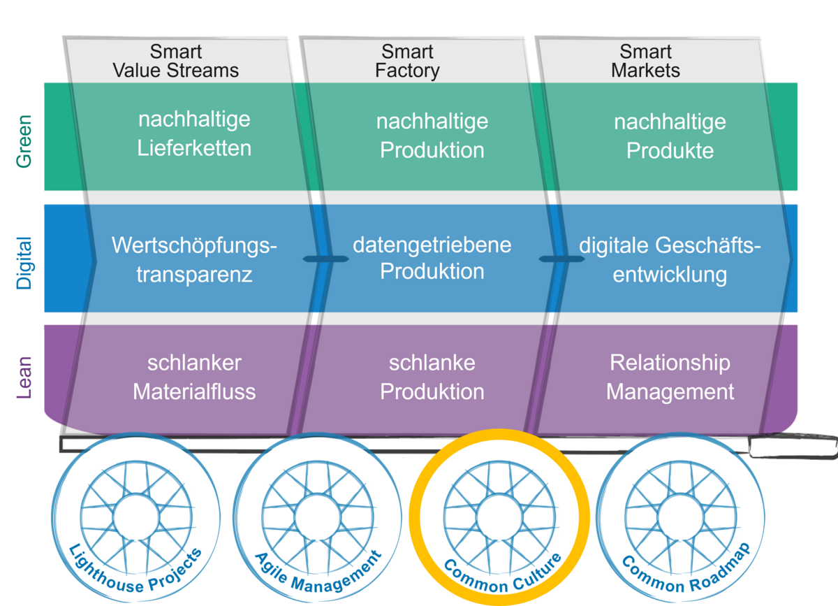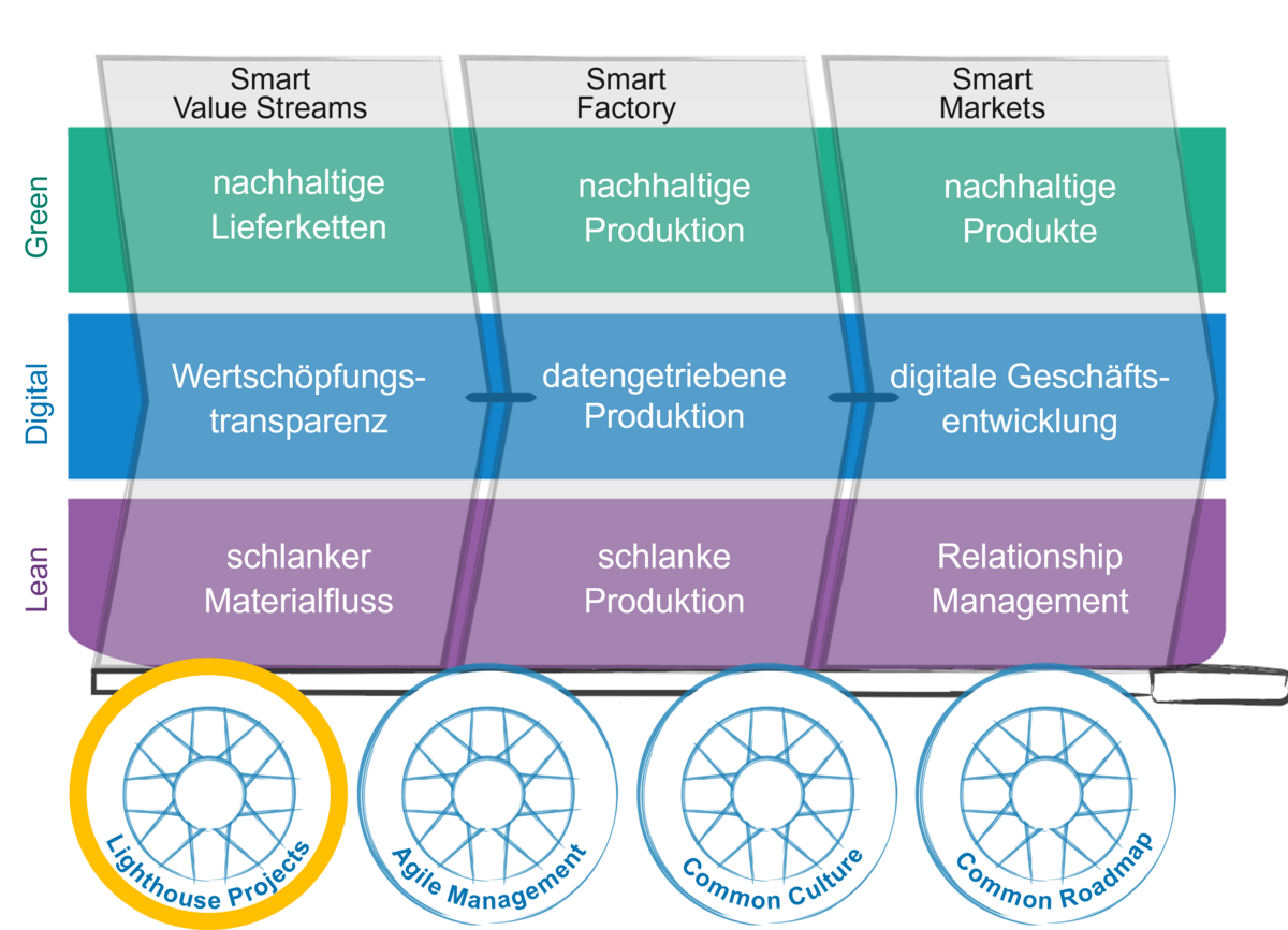Erfahren Sie, wie Sie eine integrierte Zukunftsstrategie entwickeln, Prioritäten klar definieren und Verantwortlichkeiten entlang der drei Transformationsfelder Lean, Digital und Green festlegen.